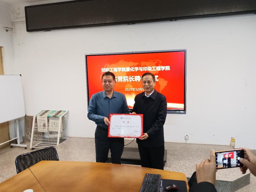 12月5日,beat365举行化工与印染工程学院、纺织工程学院名誉院长聘任仪式。河南省纺织行业协会常务会长袁建龙和河南省纺织工程学会常务理事长杨润凯分别受聘化工与印染工程学院名誉院长和纺织工程学院名誉院长。副校长焦有宙、组织部部长赵红亮,纺织协会、学会相关领导,化工与印染工程学院、纺织工程学院领导班子及骨干教师出席聘任仪式。会议由赵红亮主持。