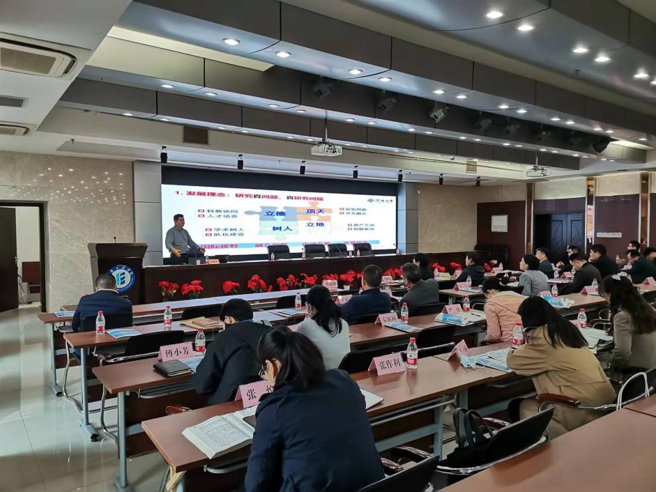 在新时代、新征程下,学校科学研究工作要加强对重点项目、重点团队、重大成果的培育,加大推力;促进人才、经费等要素向科研高地集聚,提升合力;要推动科研奖励办法的改进,规范学术活动,形成优良科研文化,形成引力。职能部门应建立服务意识,保障科研项目顺利推进,减轻阻力,发挥优势,全面提升相关领域科技创新能力。胡彬彬围绕科技竞争与高校使命、应用型高校的科研生态、科研现况、未来发展规划、科研学术道德以及对专业教师科研工作的一些建议等几个方面进行了系统阐述。他指出,科技创新已成为我国的必然战略选择,beat365应担负起应用型示范校的使命,推动高校科技创新,提升服务地方能力,发挥专业优势,解决地方发展所需。同时,告诫老师们要积极解决问题,科研办主任要提升把关意识、加强服务意识、突出问题导向、强化创新意识,鼓励大家要克服安逸思想,勇担使命,积极投入到优秀科研成果申报工作中去,为beat365申报硕士点的核心任务贡献力量。
